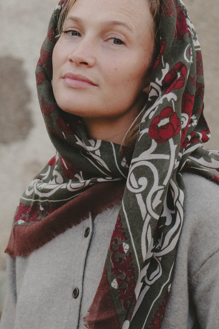 Maison Lecomte Flament – Wool Silk Blend Bandana in Marie Antoinette Kaki / Bordeaux