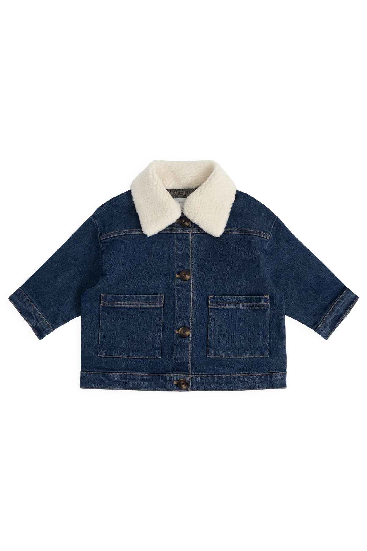 • Medium blue denim with a cozy cream sherpa collar