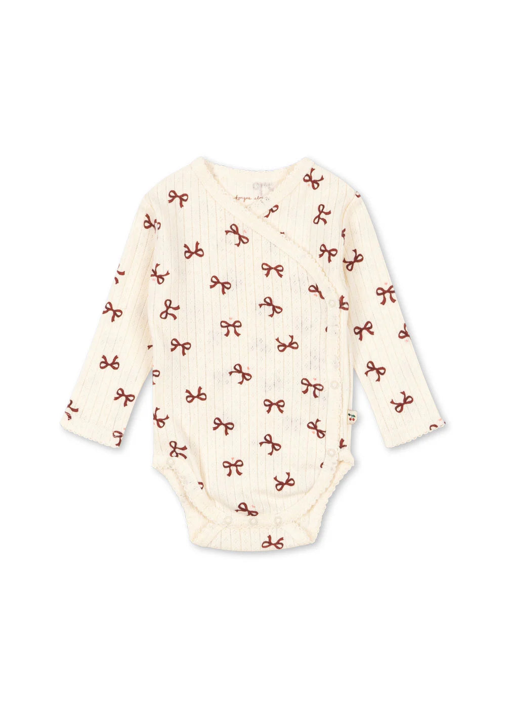 Soft body with decorative pointelle and easy wrap closure. Snap buttons along the side of the body and crotch for easy dressing.
