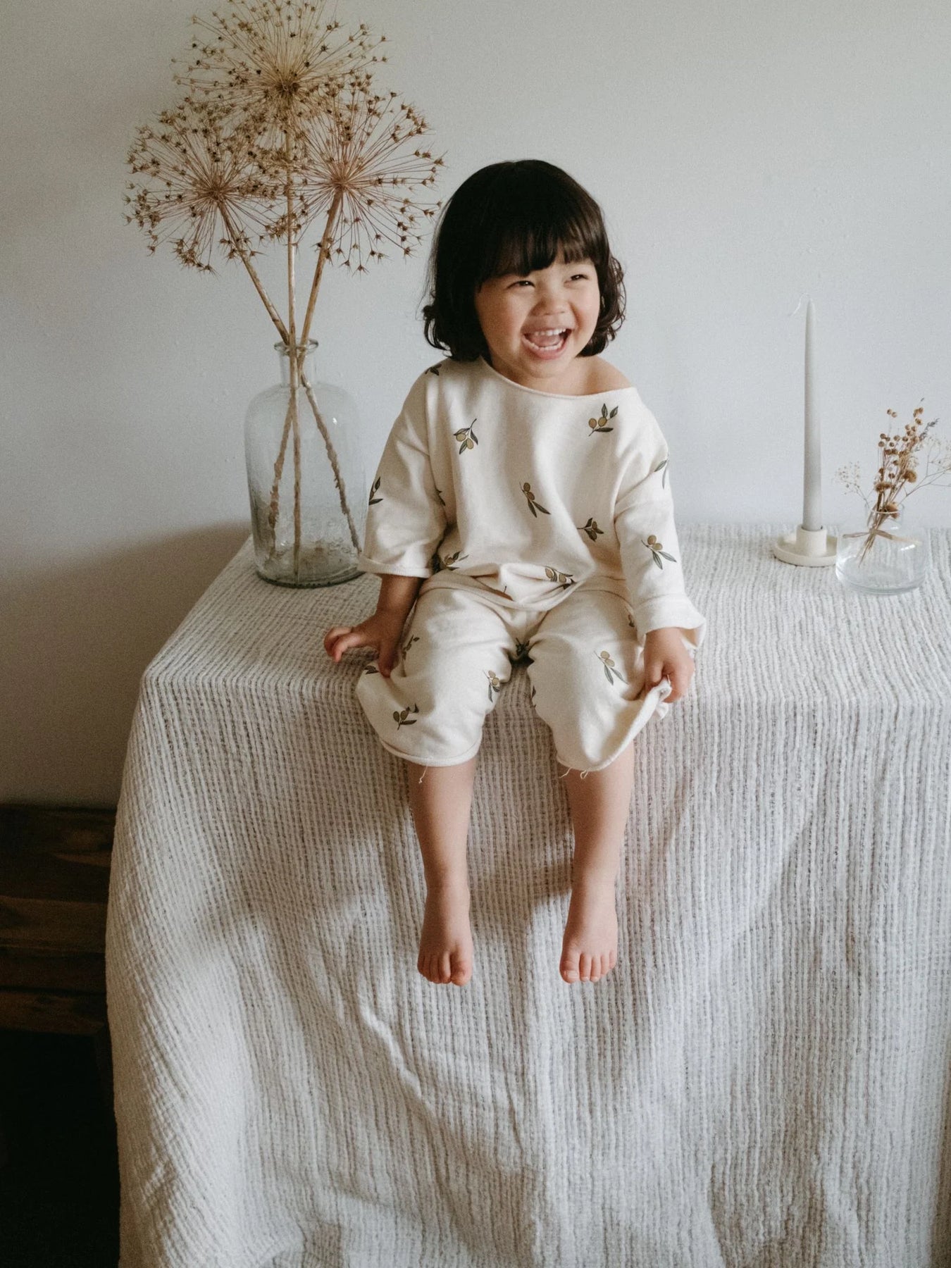 These soft bottoms with raw finish cuffs feature our signature print of olive tree branches inspired by these beautiful and nourishing plants and their delicious fruits. Mix and match or coordinate with an oversized Olive Garden boxy sweatshirt.