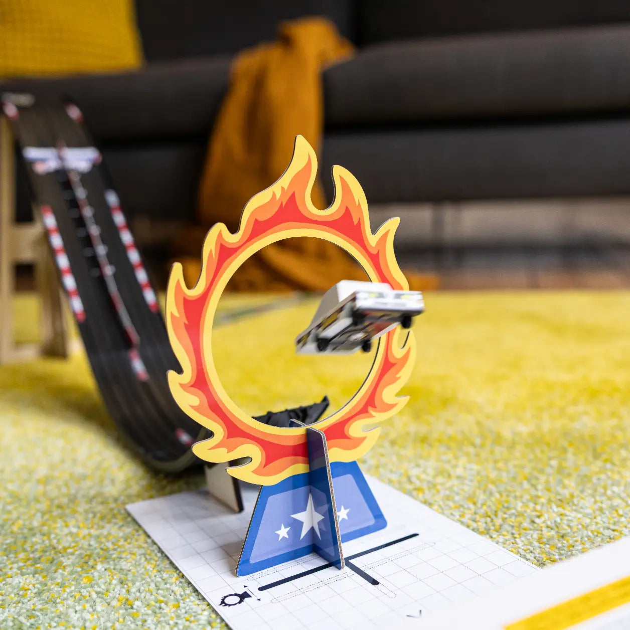 A two-lane stunt jump to test toy cars' limits. Compatible with: Includes: 1 x Stuntvil TOON™ car 1 x Ring of Fire This is Roadworks, the only 2-lane, analog, hi-speed toy track that's: Easy to Assemble Designed with a patent-pending BoneLock™ system using connectors to make tracks easy to assemble and easy to break down. Modular Endless modularity for creating and engineering exploration through open-ended play. Uniquely flexible ROADWORKS™ is a flexible, but tough rubbery composite that holds shape for building smooth runs indoor or outdoors. Not too floppy, not too hard.