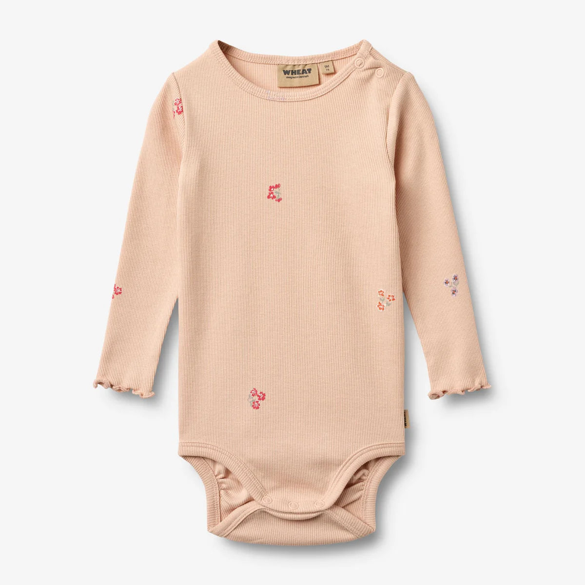 Long-sleeved body with frill details and print in organic cotton for babies.
