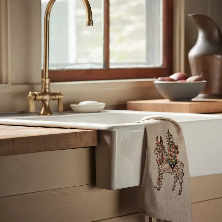 Celebrate the season with our festive Christmas Donkey. This little donkey wears colorful garlands with bells and tassels while carrying a Christmas tree and presents. Embroidered with glimmering gold metallic threads and orange, marigold, and deep teal accents. Measures 25" × 18" unfolded. Measures 12.5" × 6" folded.