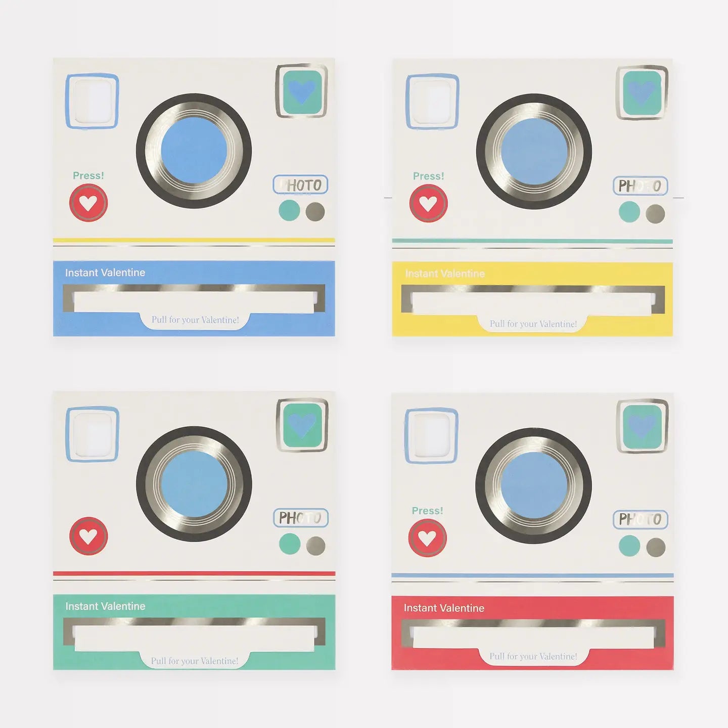 Click, click... These cleverly designed retro camera Valentine's cards are sure to delight. Each card features an insert with "To" and "From" spaces that pull out and resemble an instant photo! The set also includes sheets of stickers to personalize each card. All cards come stylishly packaged in a box that looks like an instant camera, complete with a ribbon strap. Cute!