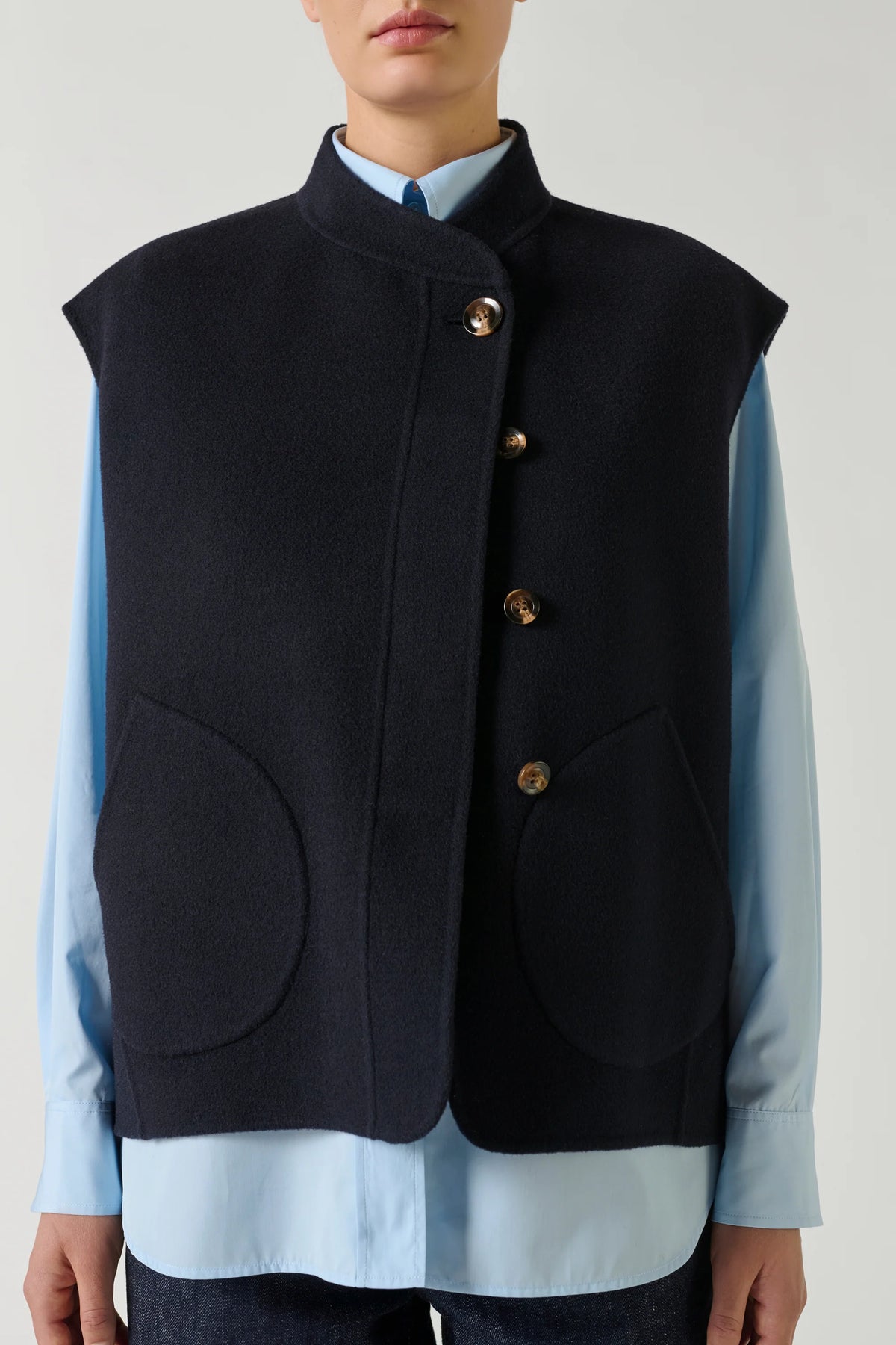 ADELINE is a vest with dropped shoulders that you can layer to your heart's content. Its warm wool fabric is unlined, allowing it to be worn under a coat without restricting movement. Bosting clean lines, the rounded patch pockets give it character and add to its oversized and round volume.