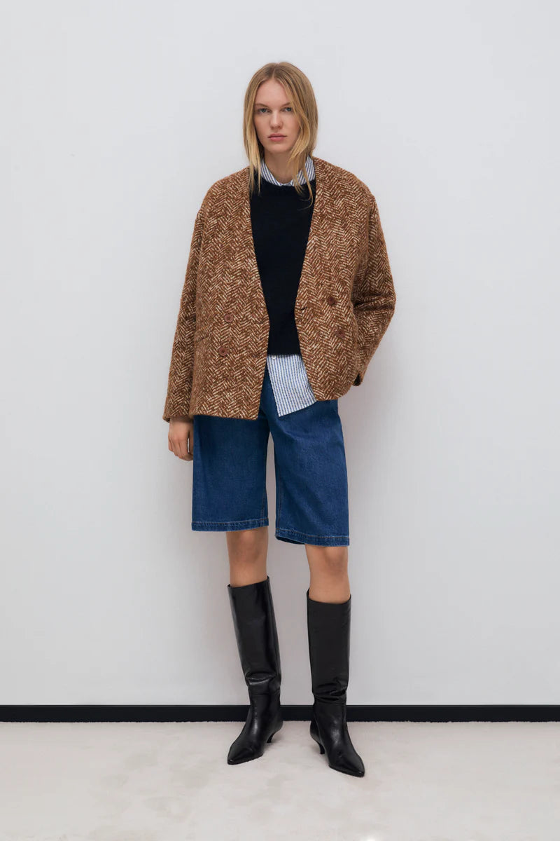 A classic double-breasted blazer crafted from soft wool, featuring four front buttons and functional pockets. Designed for a timeless, tailored look, it’s perfect for layering over shirts or knitwear for both formal and smart-casual occasions.