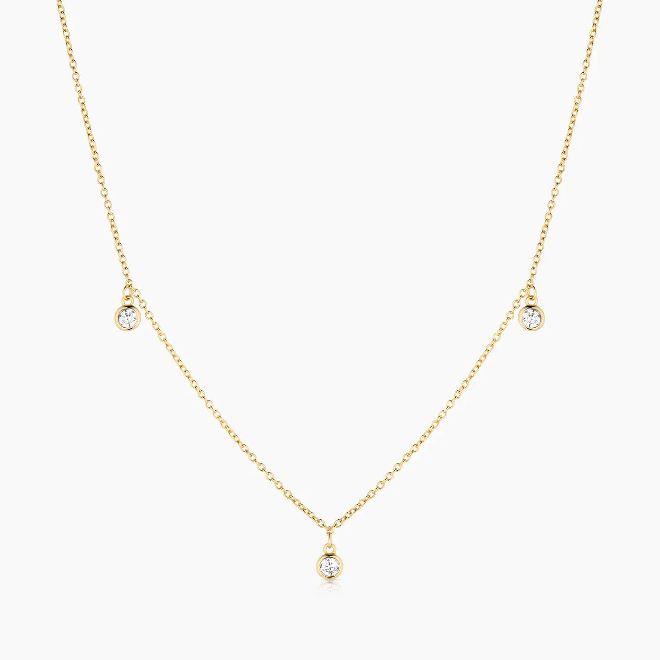 14k gold plated 1.2mm Rae cable chain necklace with three 3mm clear cubic zirconia bezels. Adjustable between 13-16".